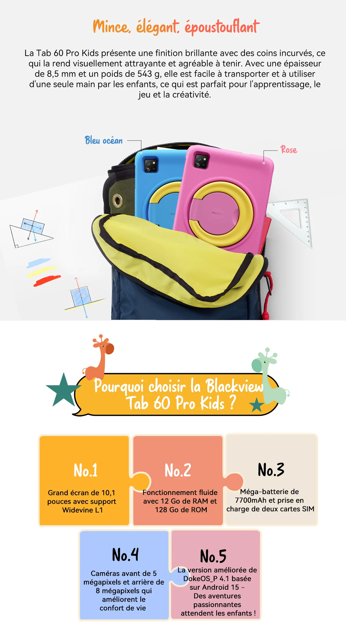 La Blackview Tab 60 Pro Kids combine puissance et sécurité pour les enfants. Équipée d'un processeur Unisoc T606 Octa-core et d'un écran de 10,1 pouce
