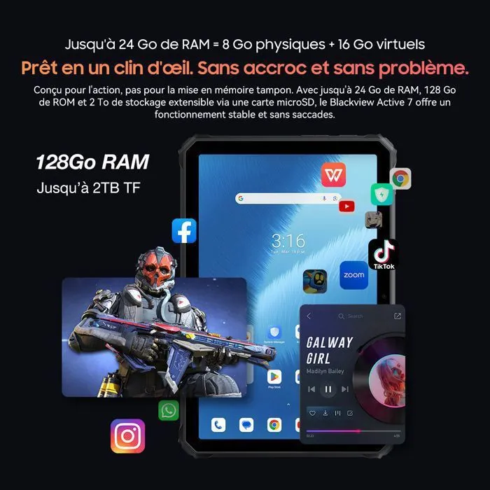 Ecran FHD + | IPS Appareil photo :16 Mégapixels/ Mémoire interne : 128 Go/ Mémoire extensible Par Micro SD Jusqu'à 1 To/ RAM 8 Go